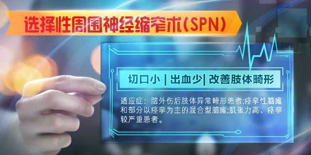 SPN手术即选择性周围神经缩窄术(Selective peripheral nerve erode art),是指局部肌肉痉挛,肌肉张力增高、部分扭转痉挛、痉挛斜颈、震颤、失调等症状而采取的手术方式,术中以神经电刺激对运动神经肌肉支配进行定位,行周围神经(比如脑瘫常用的坐骨神经或胫神经分支、臂丛神经及分支)进行部分切断。治疗分为针对大脑、小脑、脊髓的中枢手术方式和针对脊神经和四肢神经的周围手术方式。