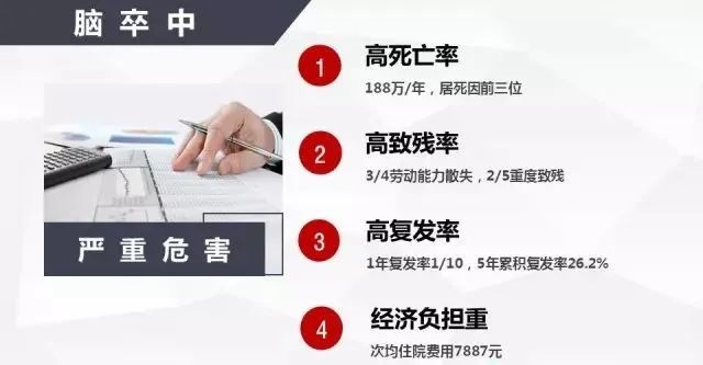 脑卒中被称为健康的“头号杀手”,存活者当中有三分之一的病人会遗留有不同程度的残疾,比如半身不遂、语言功能障碍导致生活不能自理,有的患者还因为脑卒中后患上抑郁症或者血管性痴呆等并发症。