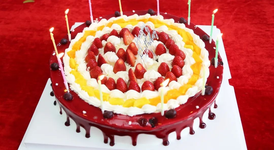 院长讲话后,生日歌再次响起,工作人员推着点好蜡烛的生日蛋糕缓缓走来。蛋糕上五颜六色的蜡烛摇曳生辉,为现场增添了一抹温馨的色彩。