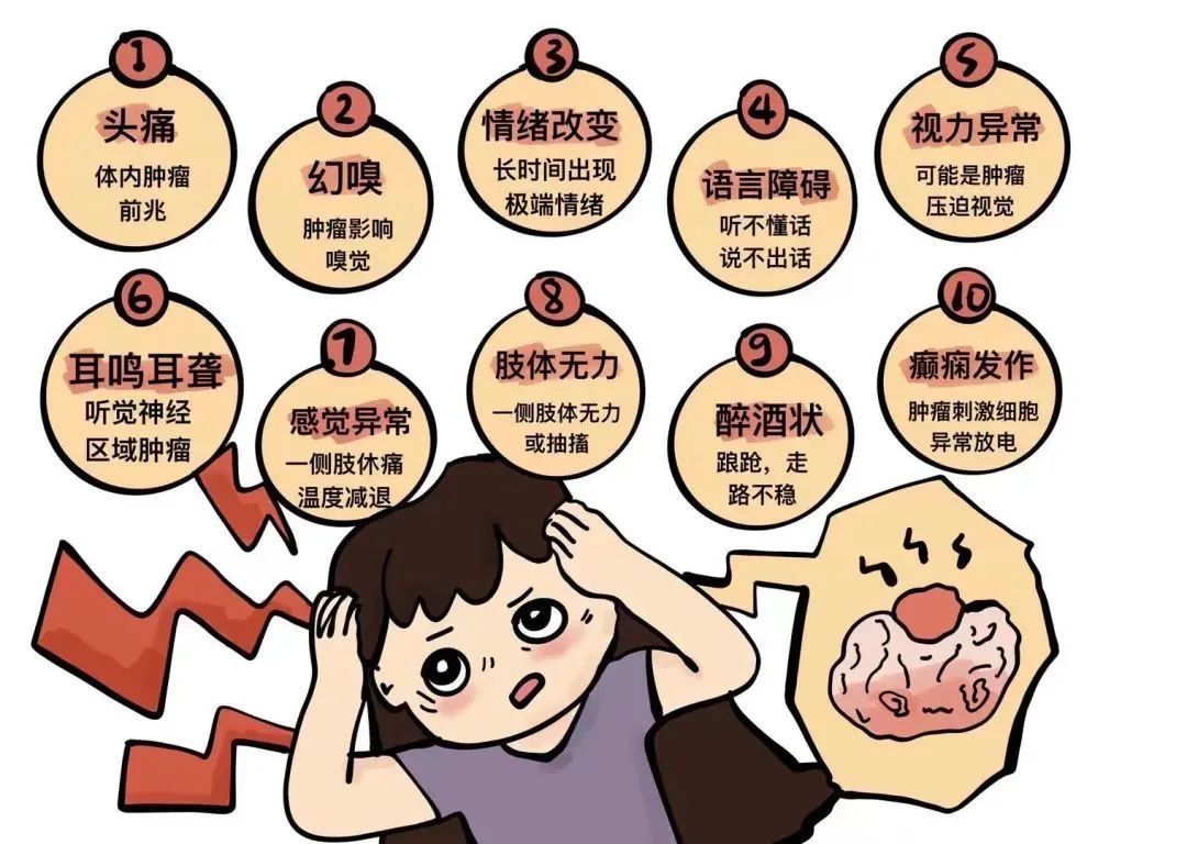 根据脑肿瘤在大脑的位置、体积大小及恶性程度的不同,表现为不同的症状。一些在日常生活中被我们忽略的小症状,也许就是脑肿瘤所发出的预警。