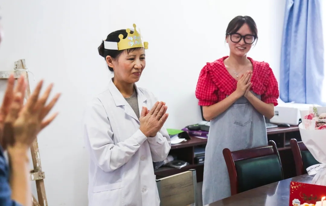 随后,周主任切开了象征甜蜜与幸福的生日蛋糕,并将第一块蛋糕递给了胥荣院长,以表达自己对院领导及同事们的感激之情。为了留住这美好而难忘的时刻,胥荣院长提议大家一起拍一张合照。