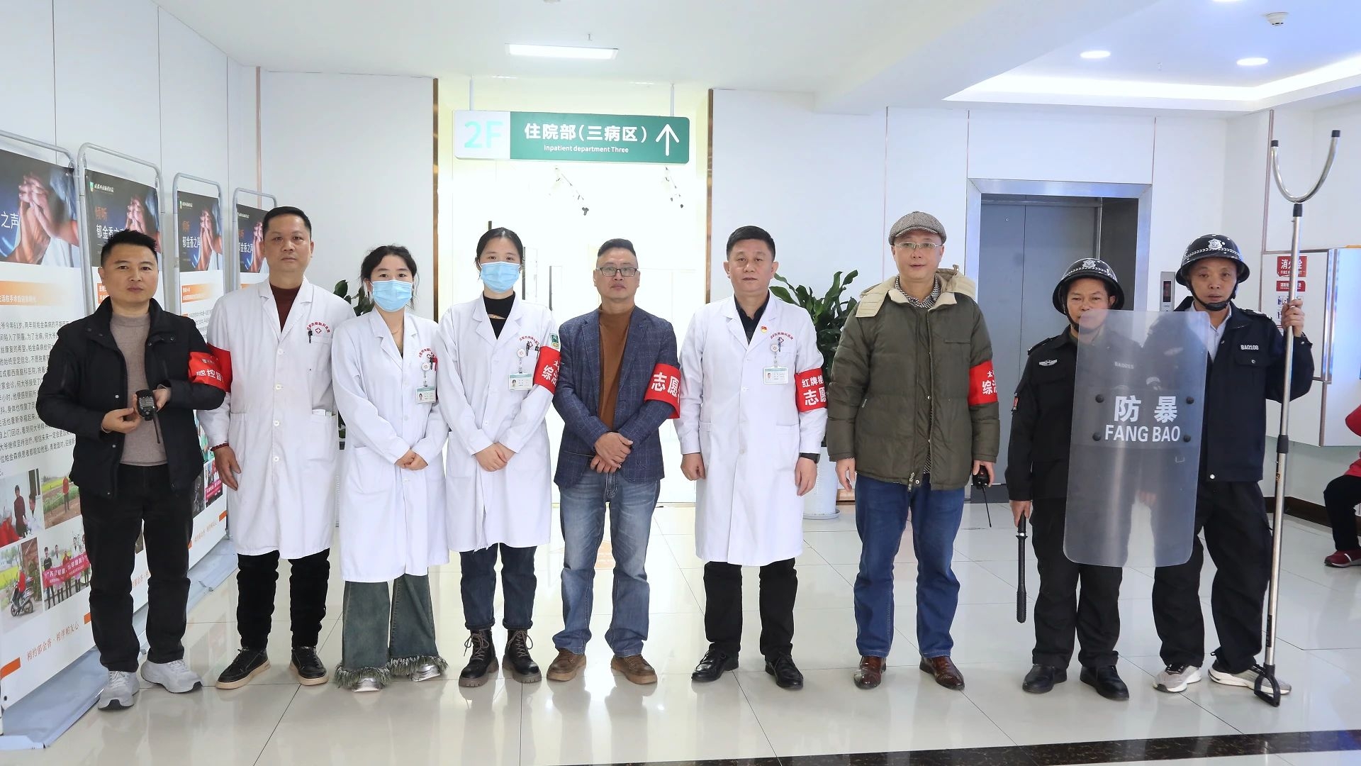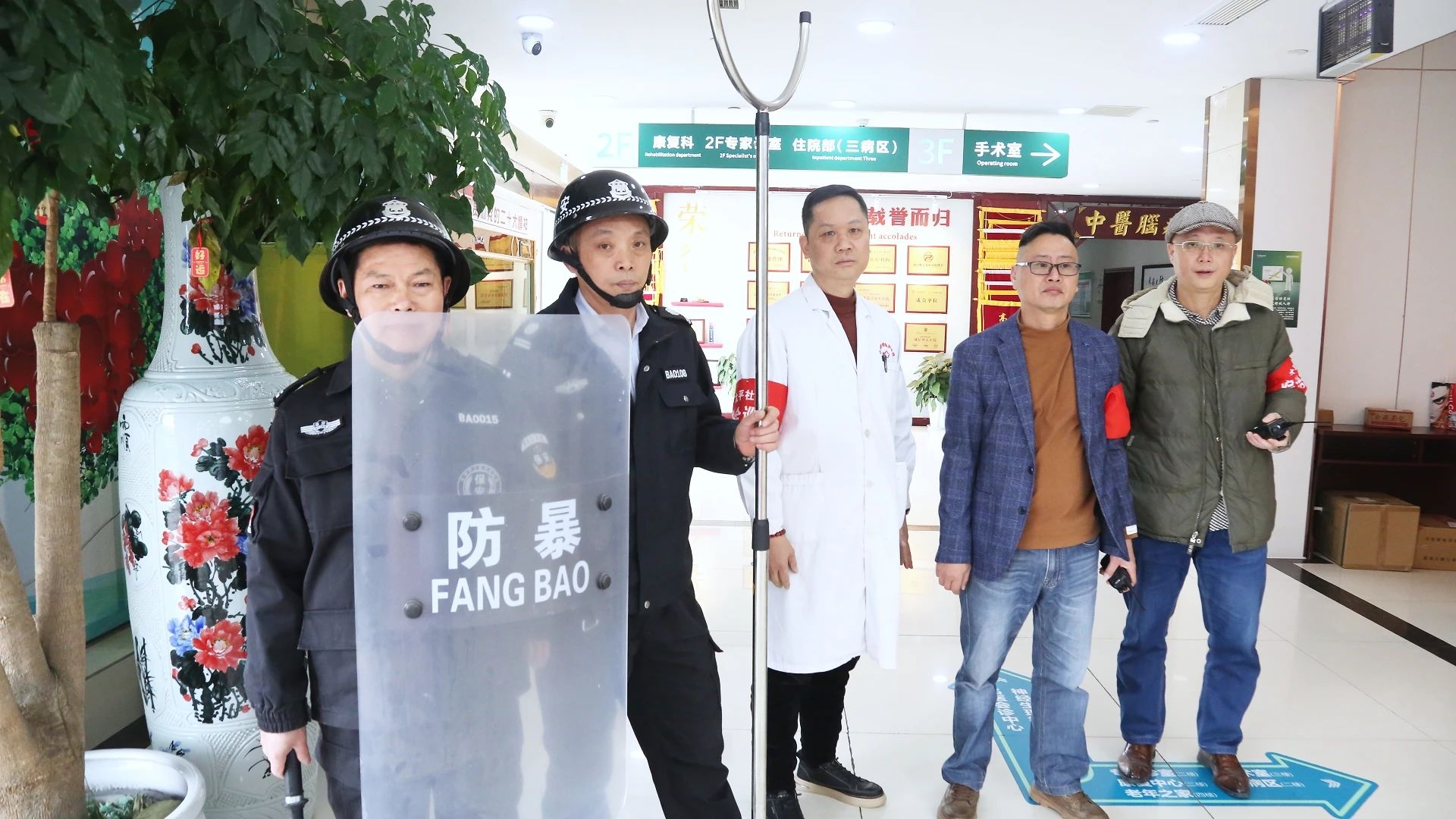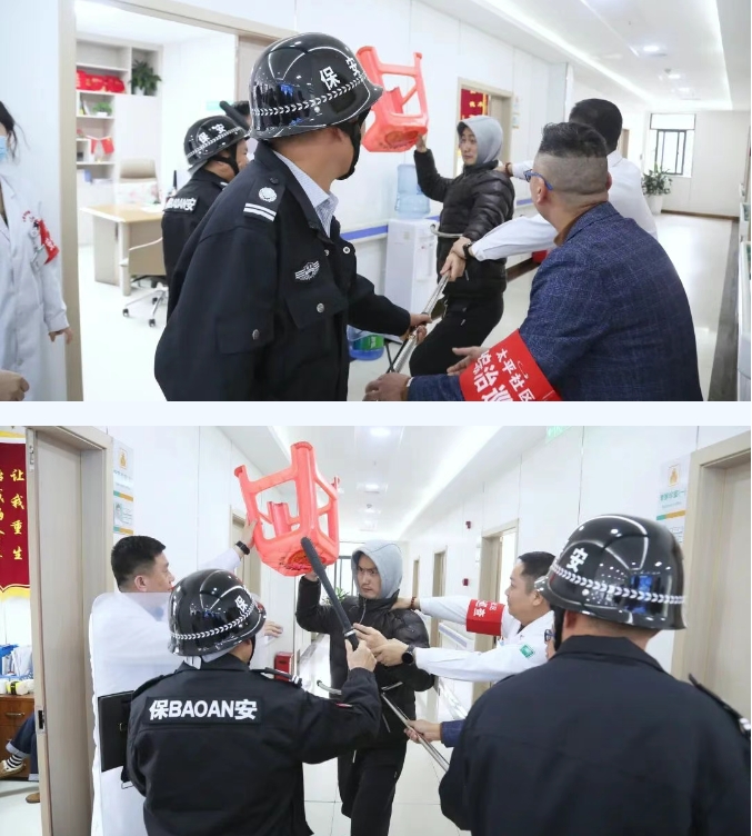 演练现场模拟一名“情绪激动人员”在住院部二楼突然闹事,持器具伤人,威胁现场医务人员和他人安全的场景。