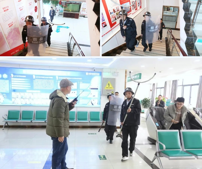医院内部接一键报警后立即启动应急预案,应急指挥小组指挥疏散现场周围患者和医护人员,调动安保人员1分钟内持防暴盾牌、防暴叉棍等全副装备到达事发现场,会同门诊最小应急单元网格长和网格员将该男子成功控制。整个演练过程紧张有序,各应急单元密切配合,反应迅速,处置得当,达到了演练的预期效果。