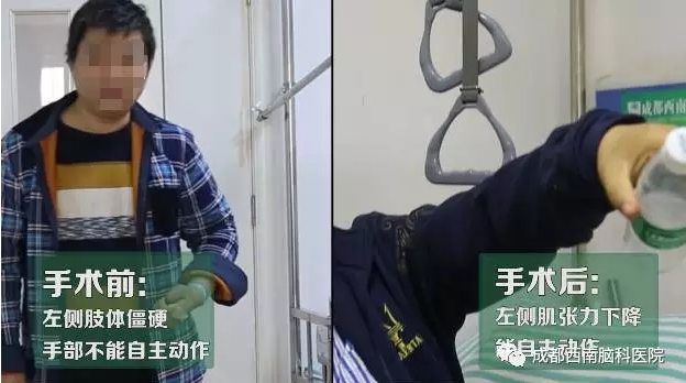 该手术由我院神经外科张涵博士主刀,手术后第三天,患者肌张力下降,左手可以握住物品,足部外翻明显改善。手术后的全某的左侧肢体功能障碍明显改善,全某表示:现在,我慢慢地左手和左脚都使得上力了,相信经过后期的康复训练,一定可以逐渐康复的。