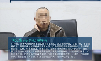 1年多前,何先生出现头部不自主点头,之后越来越严重,头部下垂厉害,不能自行抬头,需要用手扶才能保持头部正常位置,在嘴巴周围也可以明显的看到痉挛。