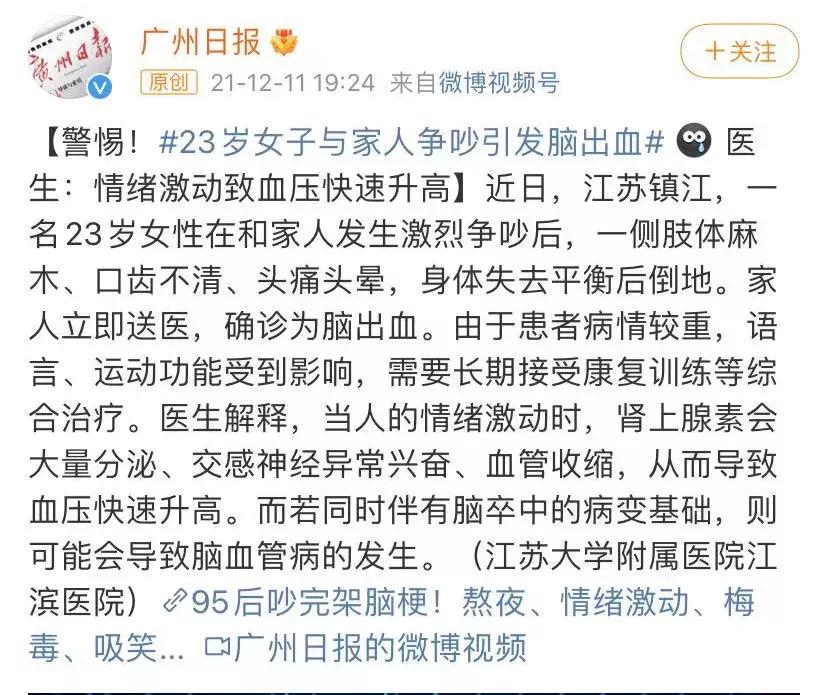 近日,23岁女子与家人争吵引发脑出血的事件大家都看到了吧,脑出血是日常生活中大家较为熟悉的一种疾病。很多人可能都听说过某某和别人生气、吵架的时候突然头疼恶心,随后昏迷不醒。