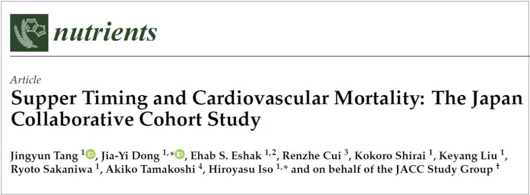在这一研究中,日本大阪大学研究团队分析了71833名,年龄在40~79岁的参与者数据,重点考察了他们的晚餐时间与中风(包括出血性中风和缺血性中风)、冠心病、总心血管疾病死亡风险之间的关联。