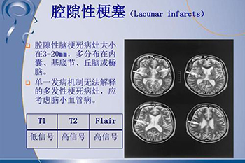 是指大脑半球或脑干深部的小穿通动脉,在长期高血压的基础上,血管壁发生病变,导致管腔闭塞,形成小的梗死灶。发病率很高,占脑梗死的20%-30%,常见的发病部位有壳核、尾状核、内囊、丘脑及脑桥、少数位于放射冠及脑室管膜下区。腔隙性脑梗死是脑梗死的一种,是指发生在大脑深部直径15mm以内的小梗塞。由于发生闭塞的血管小,病灶小,所以一般危害也比较小。