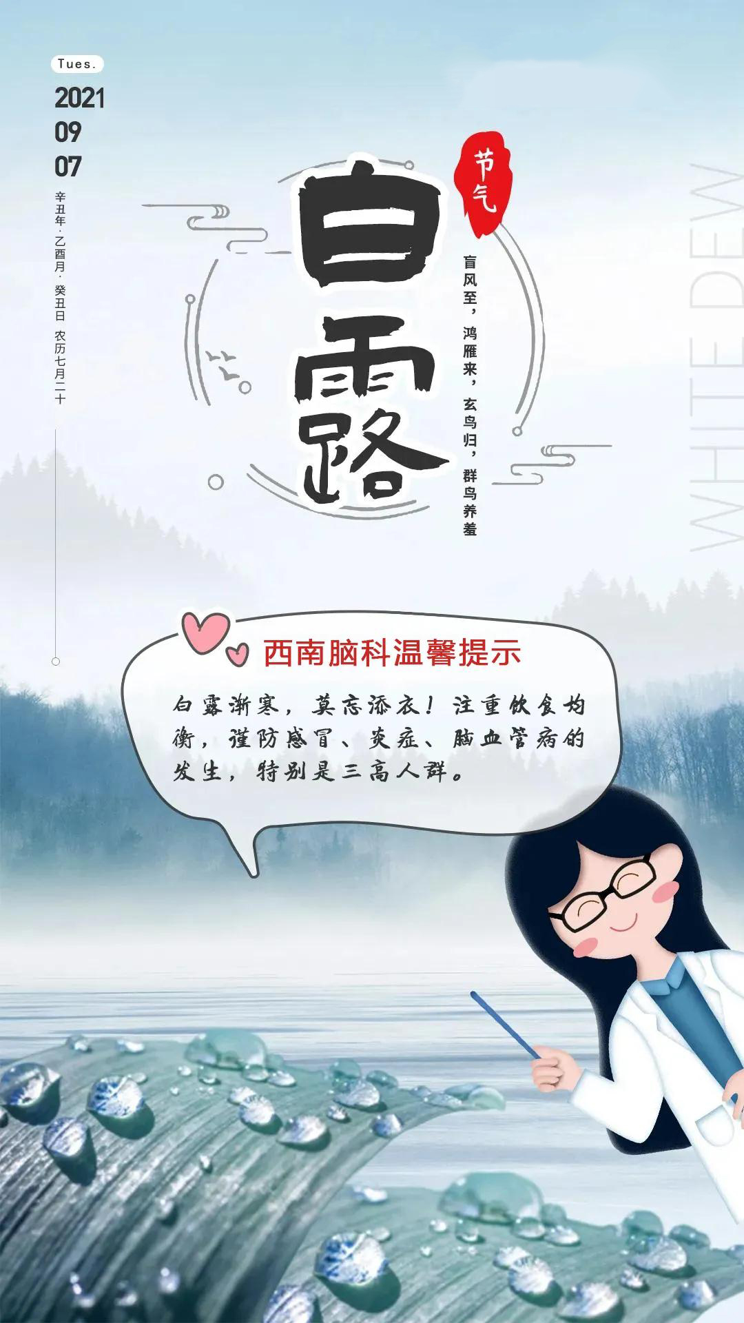 白露也是全年中昼夜温差较大的一个节气,此时,脑血管易受气温骤变影响引起收缩、痉挛,发生供血不足,从而诱发脑梗塞、脑血栓等。特别是中老年人,机体自身调整机能下降,对气候变化的耐受性差,极易发生脑血管疾病。对于脑血管疾病患者而言,这个时期可以称得上是“多事之秋”。
