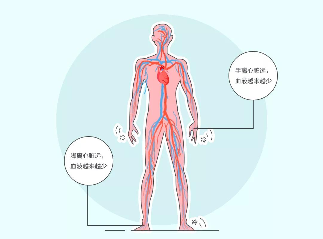 手脚是离心脏最远的地方,血管在传输热量的路途中,热量会在沿途被消耗,所以到达手和脚等末梢组织器官时已经没有什么余货啦,我们的手脚自然比其他部位感到更冷。