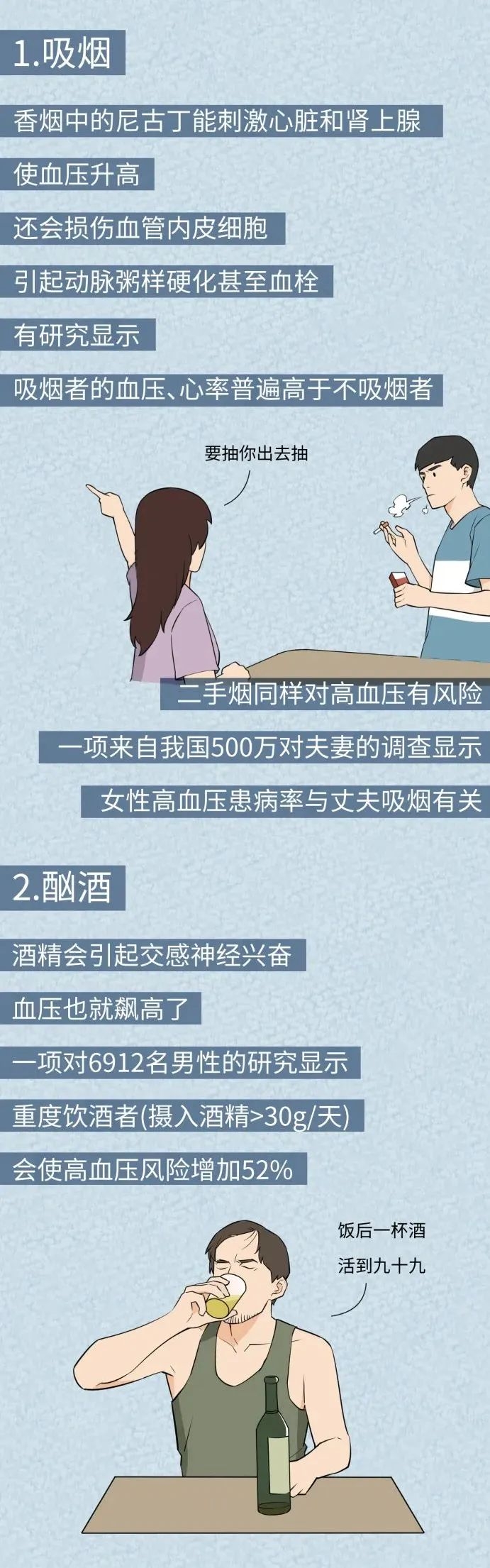 因当下过大的生活压力,人们常常有很多不良的生活习惯。例如,经常熬夜,不按时吃饭,偏好高热量的食物,抽烟喝酒等,均可引起血压升高。同时缺乏运动,体内脂肪堆积而发胖,使得身体负荷增加,导致血管压力增大而引发高血压。