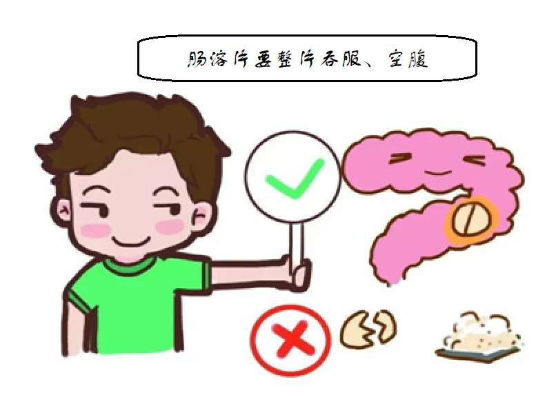 空腹时服用,胃液酸性,肠溶片不易崩解。再者,空腹时胃排空时间也快,药片能尽快进入肠道中,药膜很快溶解,药物释放,产生药理作用。所以,空腹服用较为合适。