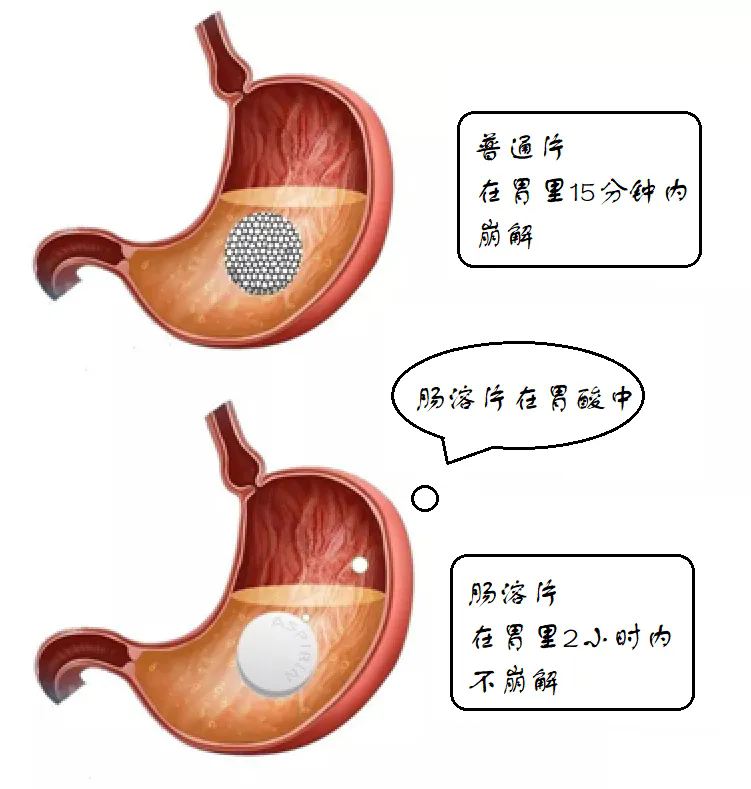 阿司匹林肠溶片在药物表面覆盖了一层耐酸而不耐碱的包膜,在胃里酸性环境中不被溶解可以整片通过胃而进入肠道大大减少了对胃的刺激作用。