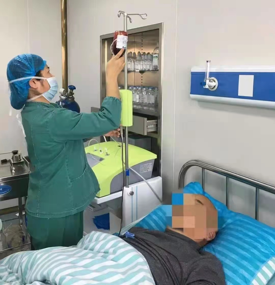 同时输入特定浓度氧化剂,几微秒内就会和血液内的物质发生化学反应,产生各种免疫细胞和抗病毒因子,然后将净化的血浆回输患者体内,达到治疗目的。