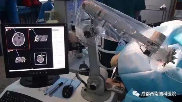 该技术是通过CT和核磁共振融合,由机器人手臂立体定向,以高于0.1毫米的精度迅速、准确利用微电极定位帕金森患者脑内震颤和僵硬细胞准确位置,通过监测细胞水平信号,用导针对病灶进行调控,达到临床功能性恢复的目的。