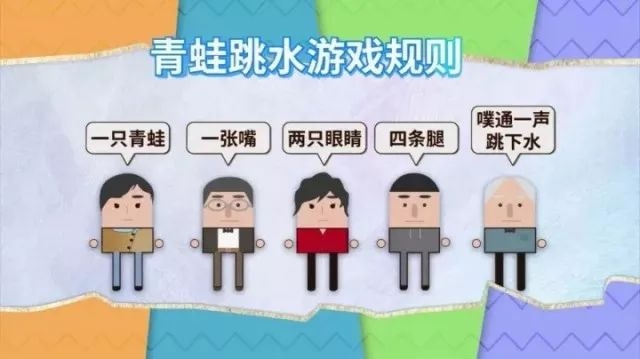按照“一只青蛙”、“一张嘴”、“两只眼睛”、“四条腿”、“噗通一下跳下水”的顺序,一人接一句,青蛙数依次累加,速度依次加快,数算错误的人淘汰出局,正确到最后的人获胜。