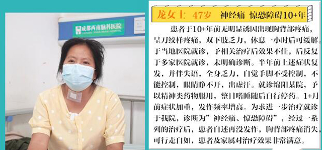 10+年的一天,龙女士起身上厕所突然就站不稳了,胸背部开始出现如针扎、似刀绞一样的疼,疼了半个小时自行缓解。之后每年都会有两三次发作,当地医院就诊治治疗果不佳,辗转多家医院未明确诊断。半年前上述症状复发,并伴失语,全身乏力,自觉手脚不受控制,眼睛睁不开,出虚汗。就诊绵阳某院,以“癔症发作”给予精神类药物服用,出现严重的胃肠道反应和身体不适,整日嗜睡,症状没有丝毫缓解,后自行停药。1+月前症状加重,发作频率增高,来到我院寻求进一步治疗。