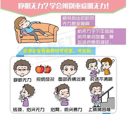 二、重症肌无力患者的四肢肌群受累:下肢受累时,先出现上楼腿软,上提下肢感到疲劳,逐步发展为上台阶或上公共汽车困难,或骑自行车刚开始时能上车,但没骑多远,便因肌肉无力,下车困难而跌倒,另外还有下楼时易跌,蹲下后起立困难等等;上肢受累时,两臂上举不能,梳头、刷牙、穿衣困难。